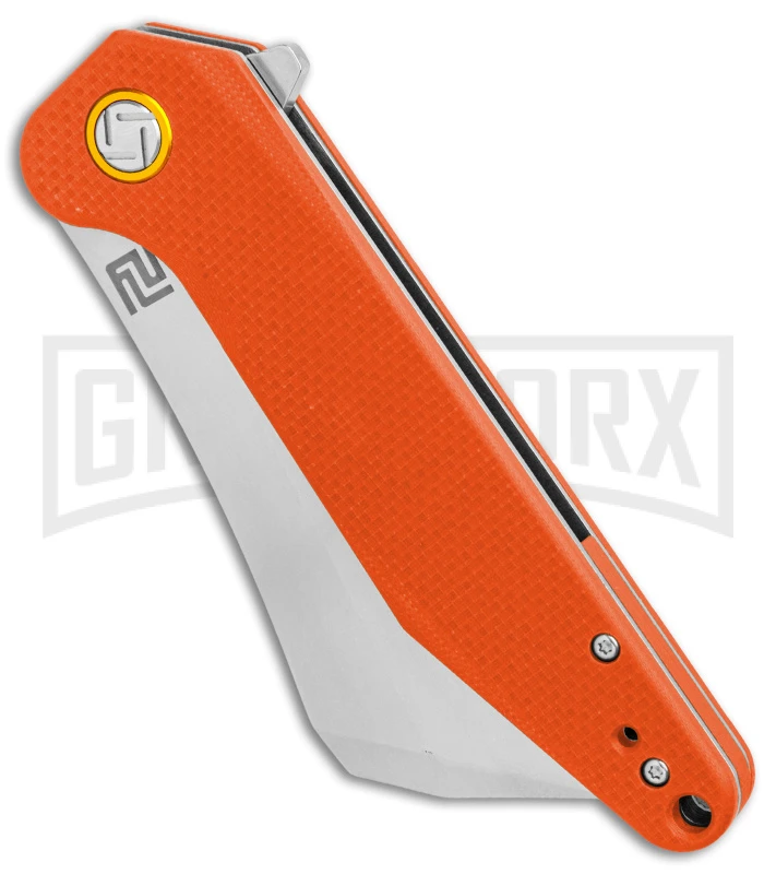 Add a one of a kind design to your collection with the Artisan Cutlery Osprey folding knife. This model is outfitted with a modified sheepsfoot blade and an orange G-10 handle. The ultra wide blade is made from tough D2 steel for making light work of any difficult cutting task. Skeletonized stainless steel liners reduce weight while providing a solid framework for the handle. An integrated lanyard hole and G-10 backspacer complete the package.