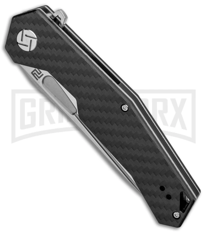This Artisan Cutlery Zumwalt has a satin blade made from D2 steel and a black G-10 and carbon fiber handle.