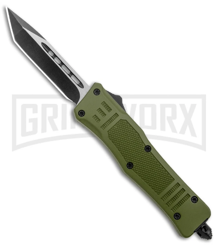The Atomic Medium Green OTF Tanto Knife offers a rugged design with solid EDC construction. This model has a two-tone steel tanto blade with a plain edge. It has a durable handle for a maximum grip and a pocket clip for comfortable tip-down carry. It comes with a stylish black-nylon case that fits easily on your belt. The side mounted slide button will activate the double-action automatic feature for lightning fast blade deployment. A pommel glass breaker finishes off the tactical design.