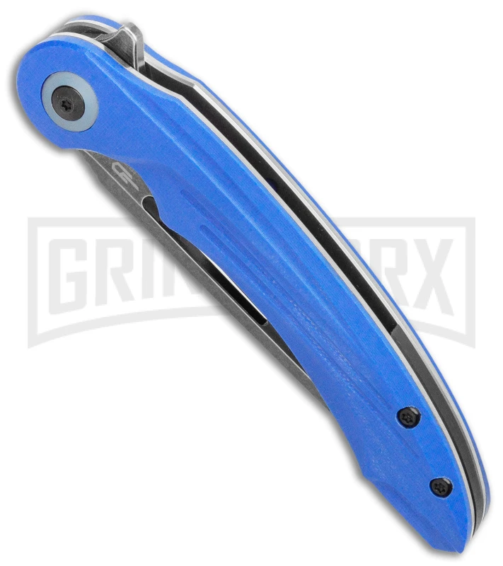This Irida has a blue G-10 handle and a black stonewashed blade.