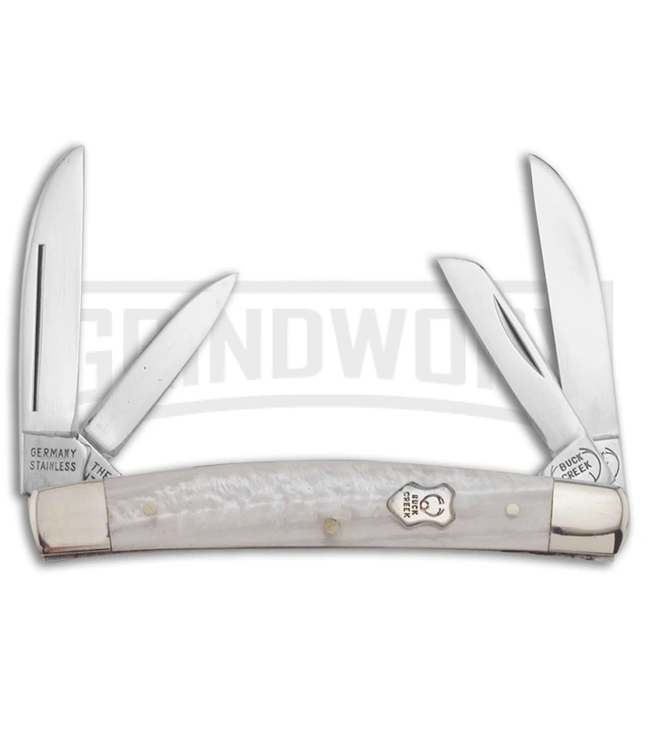 Keep the Buck Creek Little Bear & Bull pocket knife handy to tackle a variety of everyday cutting chores. The knife features dual wharncliffe blades, a coping blade, and a pen blade made from mirror polished stainless steel. This model sports nickel silver bolsters and “cracked ice” polymer handle scales.