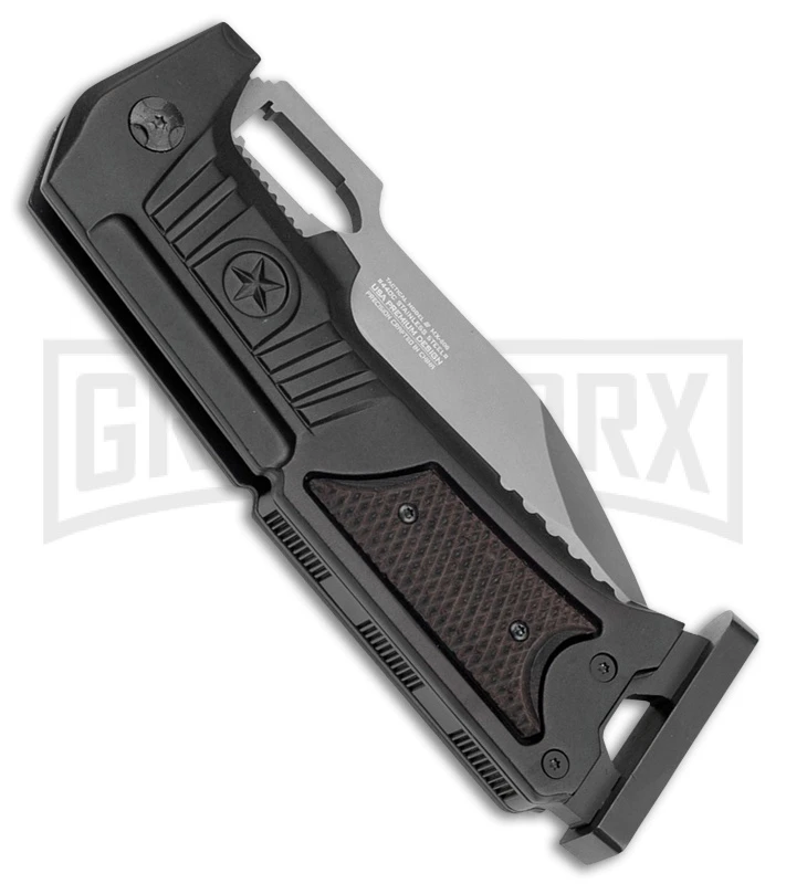 The M-Tech Xtreme Bullet is a manual folding knife that has a heavy tang that acts as a stand which you could display vertically. This is perfect if you need it sitting and waiting, ready for you to grab it and go. The 440C stainless steel, spear point blade has a gray finish. The opener is a thumb hole in the shape of a bullet. The handle is black aluminum with a black, checkered wood inlay and an over sized lanyard hole.